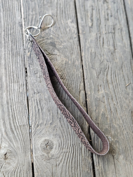 Dark Brown Floral Embossed Leather Wristlet Strap