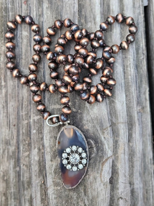 Translucent Brown/Gray Agate Stone with Rhinestone Center Pendant