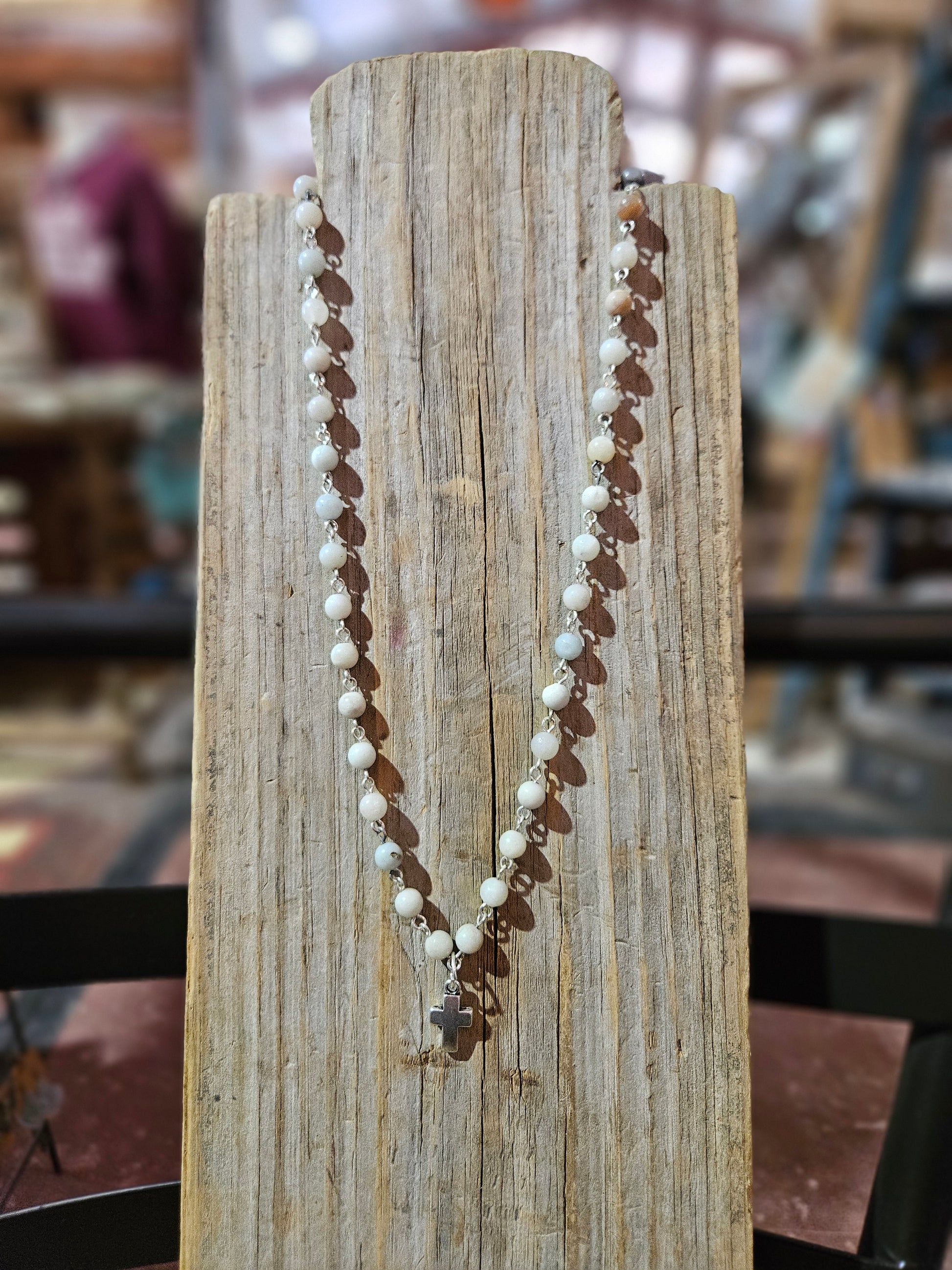 6mm amazonite beads (20") paired with a silver plated cross (.5"). A sweet reminder of faith and simplicity.
