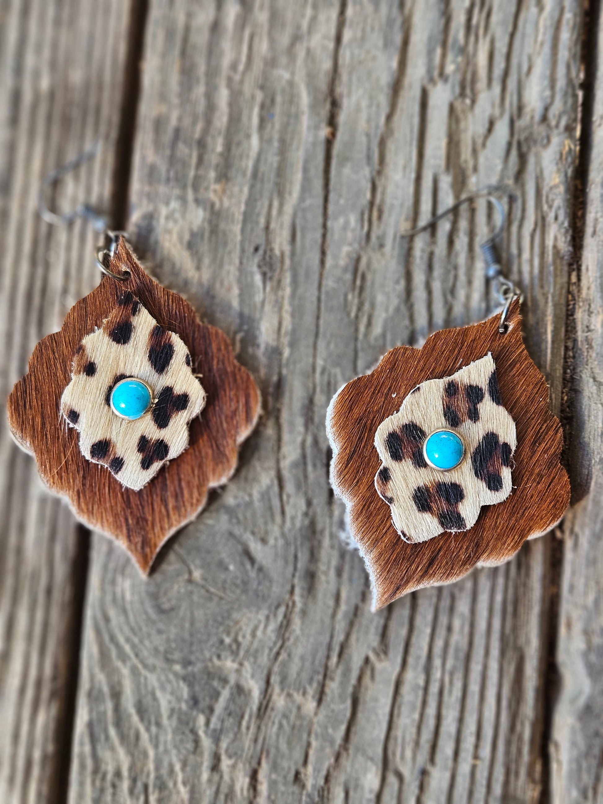Multilayer brown cowhide, leopard cowhide, and turquoise stone center with gunmetal hardware