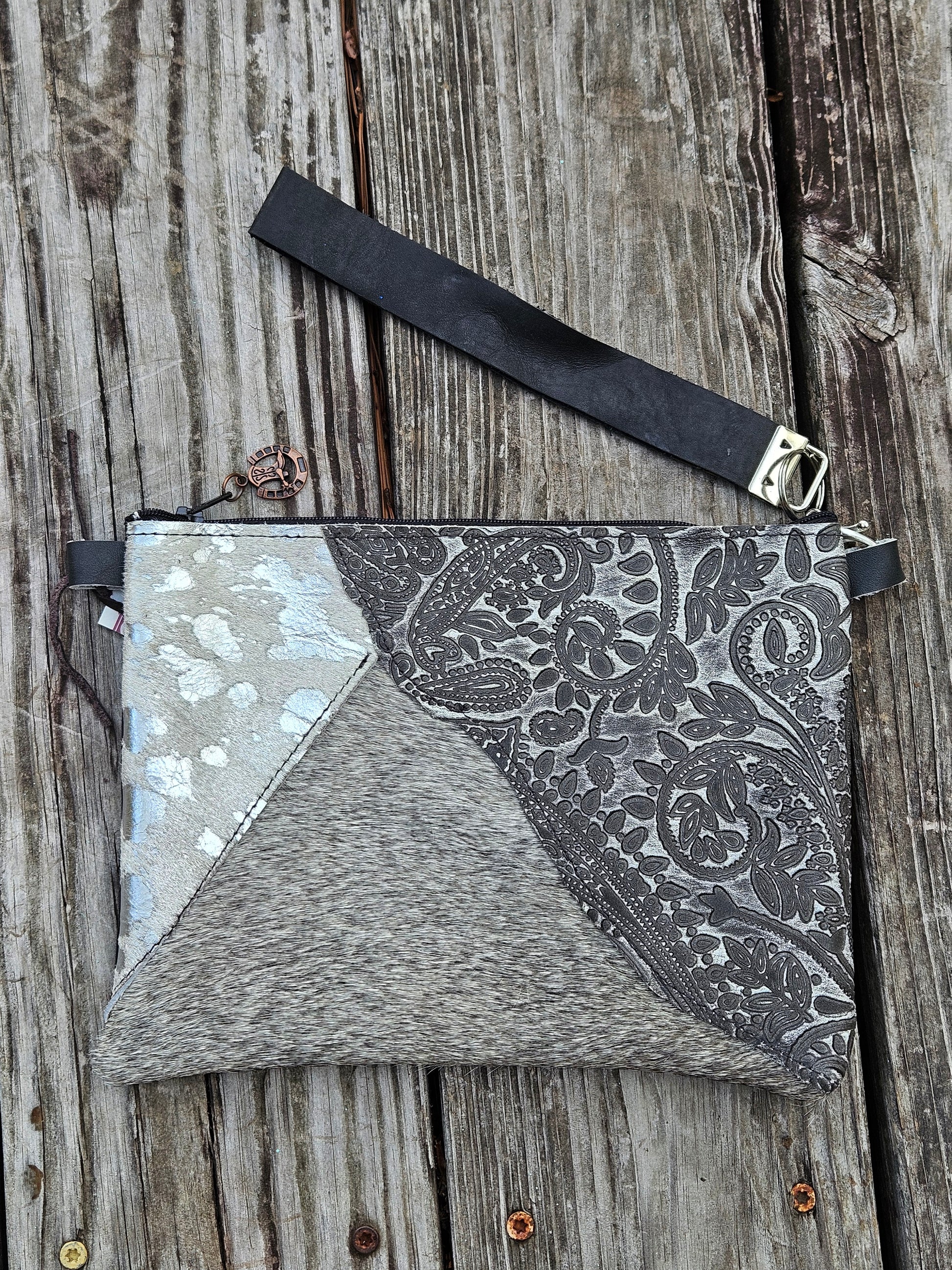 Black and gray embossed leather, white and silver acid washed cowhide, gray and white cowhide purse completed with a black leather wristlet strap, solid black back, and silver hardware